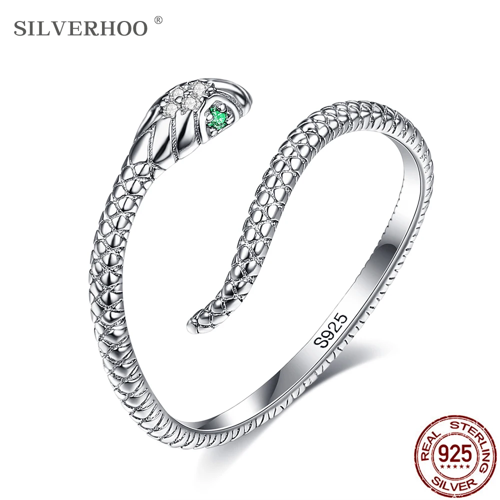 Name: SILVERHOO-Anillo de serpiente para mujer, anillos ajustables de Plata de Ley 925, circonia verde, joyería fina Retro, diseño de texturas bonitas